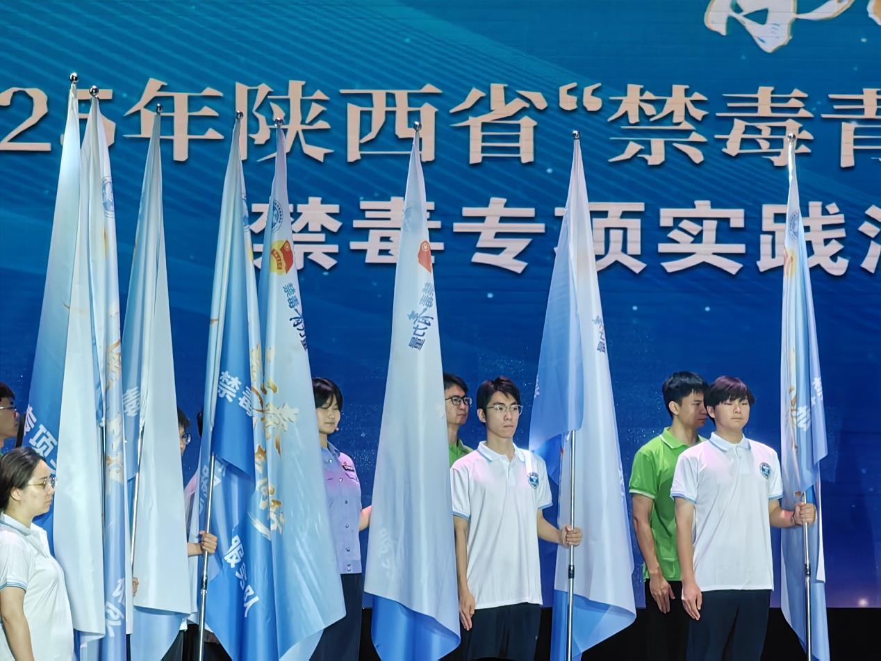 本次活动通过科技、艺术与传统文化相结合的创新形式,全方位展现陕西省禁毒工作成果,号召全社会特别是青少年群体积极参与禁毒行动,共同守护“无毒三秦”。作为禁毒宣传的骨干力量,来自全省21所高校的禁毒实践团代表在现场接受了“禁毒青力量”2025年大学生暑期“三下乡”社会实践授旗,以青春誓言扛起禁毒重任。我校电子工程学院学生高杨岩锟作为代表之一,上台接过象征使命与责任的“禁毒青力量”旗帜。