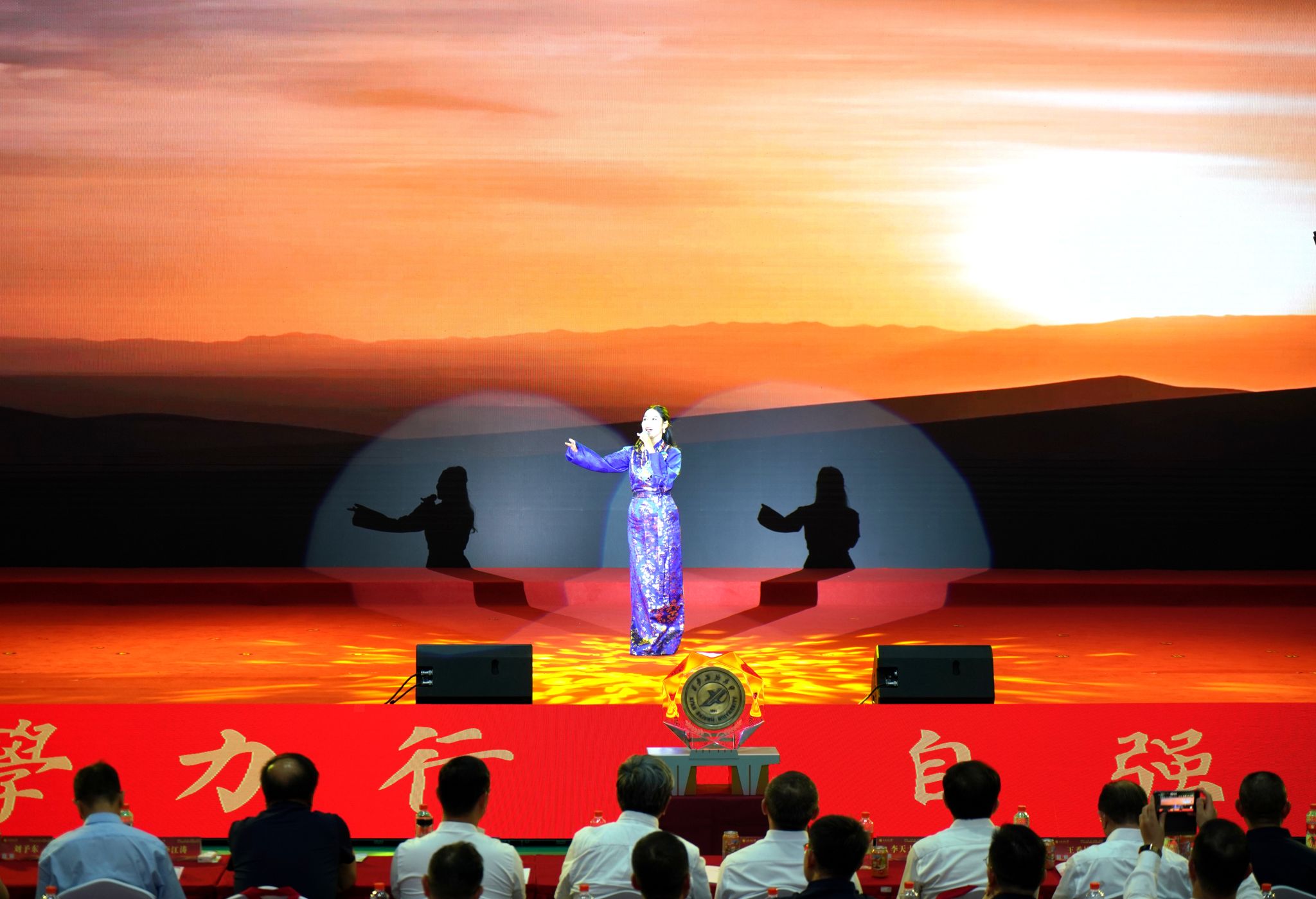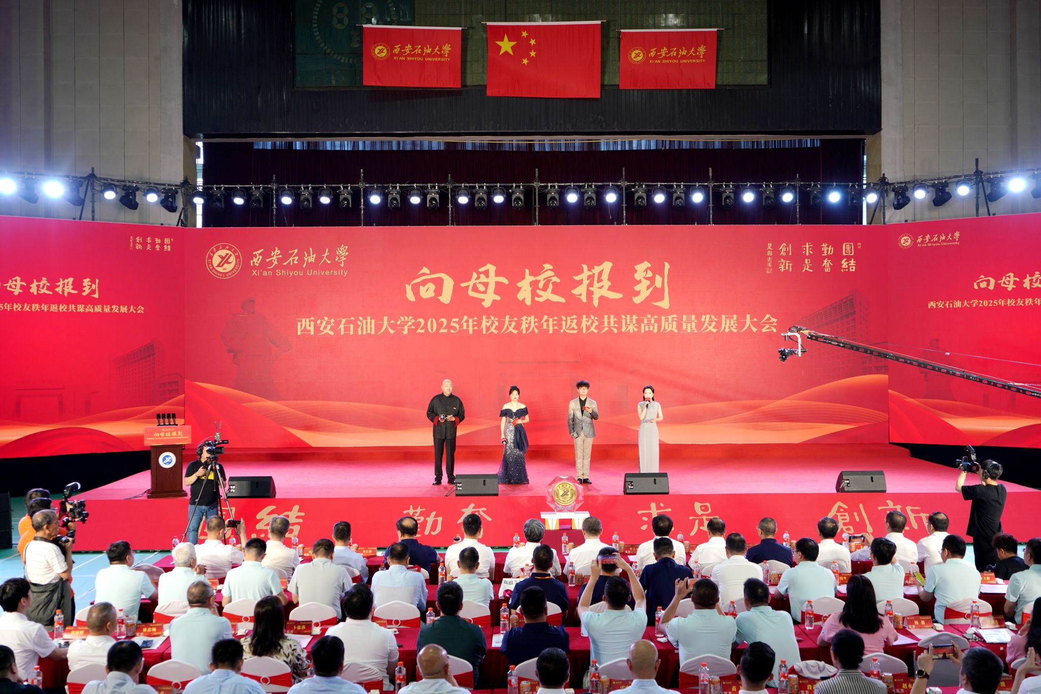 校友代表赵奇、王佳琦、张泽宇、杨硕,教职工代表郑伟,在校生代表李莹欣、朱美霖、王子聪、马海阿呷表演的歌曲串烧带领校友重温青春记忆,传递校友间的深厚情谊;校友代表段亚曼演唱的《绿叶对根的情谊》诠释了校友与母校的紧密联系;校友代表汪贇、孙海东、唐雯莉、接叶楠带来的配乐诗朗诵《年轮—致我们的母校》追溯了学校发展历程,歌颂了母校的育人成果;校友代表嘉木演唱的《天路》、校友代表何振、高金秀演唱的《共筑中国梦》及师生合唱的《辉煌明天》《我为祖国献石油》,以激昂旋律展现奋斗精神,以恢弘曲调传递共同愿景,彰显了西石大人的精神风貌与家国情怀。