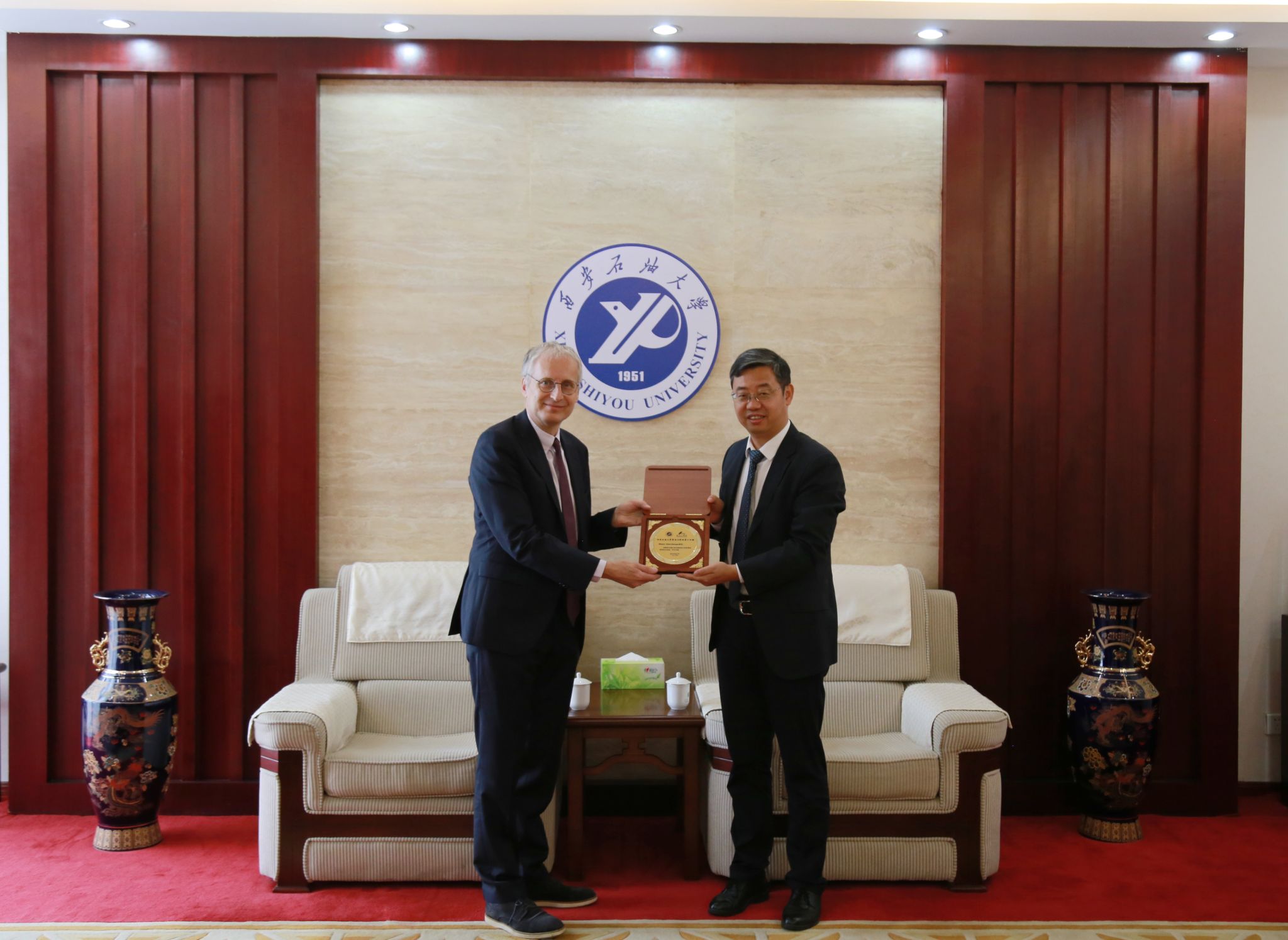 王进富代表学校对舍恩伯格教授的到访表示热烈的欢迎和衷心的感谢。他首先对能源行业面临的智慧化问题、中国智慧油气田开发发展现状及我校目前致力于人工智能教学科研体系的改革作了简要介绍,并表示希望通过此次交流,进一步提升我校人工智能领域的学科建设和科学研究水平。舍恩伯格教授对学校的邀请表达了感谢,并围绕我校油气能源、人工智能学科的发展、科研、人才培养等提出了建议。